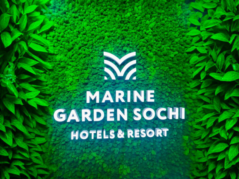 Панно из стабилизированного мха с применением холодного неона для контражурной подсветки по периметру. МетаБуквы изготовлены с минимальной толщиной 40мм, для равномерной засветки. Доставка и монтаж в г. Сочи в офисе продаж одного из застройщиков.